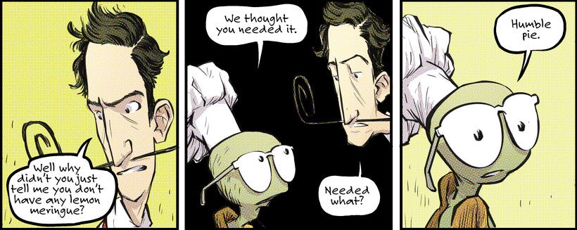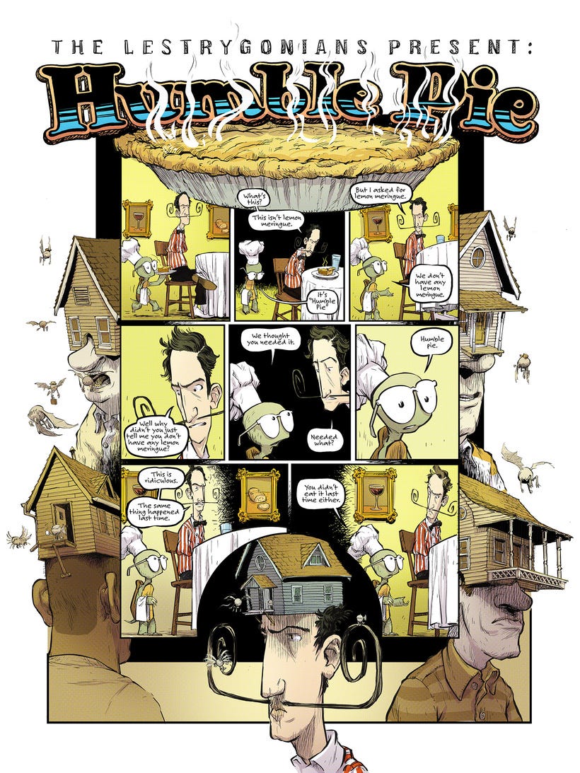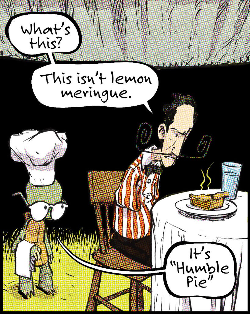 In all honesty, I have to say that my opportunities to imbibe in humble pie are more numerous than I would like to admit. Aside from hopefully being a funny comic, it’s also a message to myself to grab a fork and dig in.
